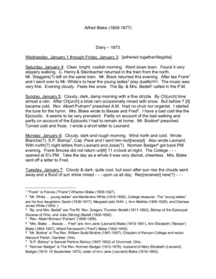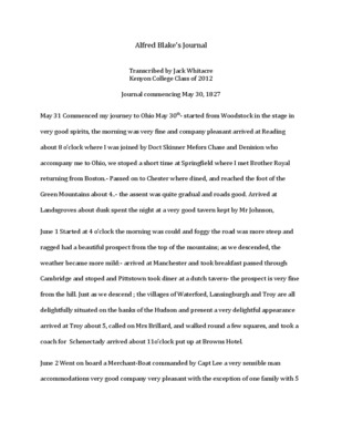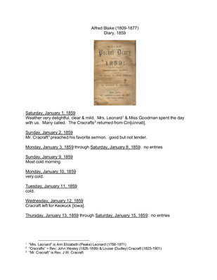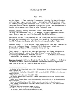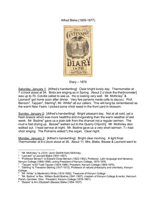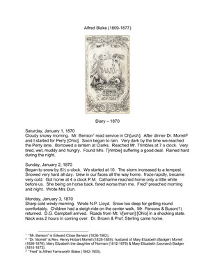 Although Blake’s original diaries are too fragile to digitize, transcripts created by John D. Green, a descendant of The Rev. Alfred Blake through his son Charles Royal Blake, are posted here. Each transcript includes an index of topics and individuals mentioned.