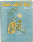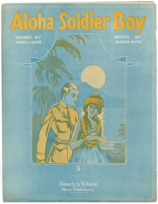 This piece of sheet music is a bifolio with four pages. The cover depicts a man dressed in a military uniform, in a three-quarters position from the viewer. He is facing towards a woman wearing a haku head lei, a beaded necklace and a lei around her neck, and a hula skirt. She is facing out towards the viewer. In the background is a landscape featuring the ocean, palm trees, the silhouette of a mountain, and the moon. The two figures and the landscape are held within a frame shaped like an architectural structure, with a rectangular bottom and a trapezoidal shape on top.