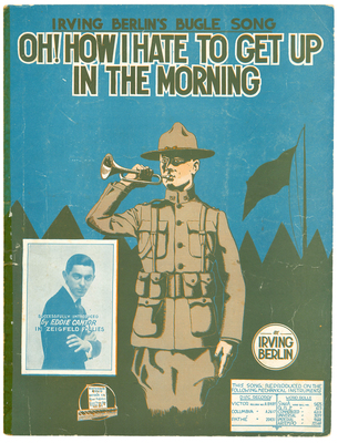 This piece of sheet music is a bifolio with four pages. The cover has a blue background and depicts a soldier in the center, playing the bugle and facing towards the viewer’s left. In the background is the silhouette of military camp tents and a flagpole. In the bottom left corner is a blue-toned photograph of a man labeled “Successfully Introduced by Eddie Cantor in Zeigfeld Follies.”