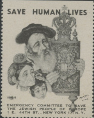 White stamp with red illustration of three Jewish people, including a bearded man with a Star of David armband. Titled, "They Shall Not Die.