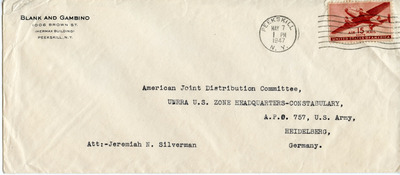 White envelope addressed to the American Joint Distribution Committee's UNRRA U.S. Zone Headquarters in Heidelberg, Germany. Printed return address to Blank and Gambino in New York.