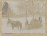 Group of students on horse-drawn sled. The Congregational Church of Gambier is in the background. Circa 1897.