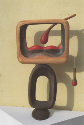 The “Water Closet” is a sculpture created from 1988 to 1993, after the artist emigrated to Austria. This sculpture is reductive and minimalistic, characterized by its sleek and rounded silhouette. From the front view, a curved square holds a square frame with a stick reaching out of it and a maraca-shaped wooden structure tied to it with a tight rope. The red colors in and out of the frame echo each other, creating a sense of dialogue. The wave painted in both black and red in the frame grants it a sense of dynamics and vibrancy. (Zhuocheng Jiang ‘26)