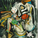 This series of works consist of six paintings and were created from 1992 to 1994. As a Uygur artist from Xinjiang, China, Aniwar draws on central Asian themes in his works and places them in a contemporary context. "In his paintings, various cultural motifs from the artist's Uighur background are employed and the theme of the desert is also dominant. Aniwar documents not only his personal visions, but a tension created by the dichotomies between Xinjiang and Beijing, the oasis and the city" ("Aniwar Mamat", OCULA, https://ocula.com/artists/aniwar-mamet/). (Yifan Shang '25)