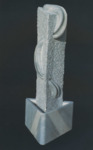 "Inner Movement" is work made in the time he emigrated to Austria. This is a triangular-prism object with a triangular base. The main body is characterized by its rough texture, contrasting its sleek base. A curvaceous, concave tube piercing through it, referring to an "inner movement," indicated by the title. (Zhuocheng Jiang '26)