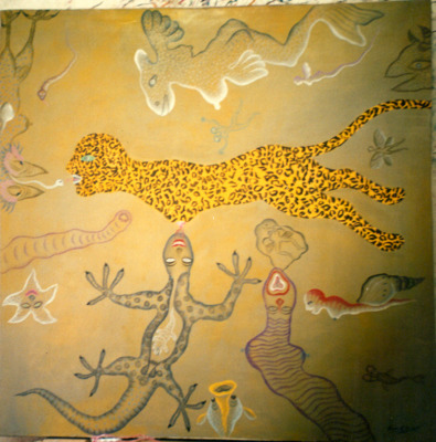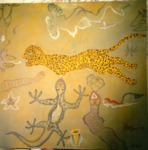 "Leopard’s Vein" is a work embodied with Sun Liang’s distinctive artistic language. It presents unknown life forms floating in mid-air; some of these creatures take on reptilian shapes, marked by leopard spots and possess sexual organs, yet their movements resemble those of microscopic unicellular organisms—two-dimensional, floating, engaged only in the most basic acts of eating or sex. Their awkward bodily poses and structures appear like clumsy textbook reconstructions of prehistoric animals, while at the same time evoking mental things rather than physical objects, as if disparate elements had been stitched together in a dreamy way. (Zhuocheng Jiang '26)