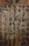 This piece is larger than many of the artist's works. She painted intersecting lines onto a 40 x 60" sheet of paper to create a grid with small squares. In each square, she had then painted in a symbol, evoking calligraphy on grid paper. The paper appears corrugated in some sections and the edges of the symbols are blurred. The title suggests that this piece is Hou's interpretation of stone slabs used for calligraphy practice. (Nicole Wang '26)