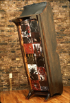 The artist has painted the bottom of a couch with red, black, and white ink. Furthermore, Hou has divided the surface into individually painted sections, which appear to depict different but related scenes. The painting style is expressive and abstract. Some brushstrokes appear to be purposely smeared or smudged, giving the piece an erratic energy. Yet upon closer look, the viewer can make out motifs of hands and triangles as well as figures hidden among shadows. The sharp borders of each painted section contrast against the chaos that they display. Overall. the red paint, aggressively applied brushwork, and abstracted figures suggests a tone of violence, secrecy, and trauma.