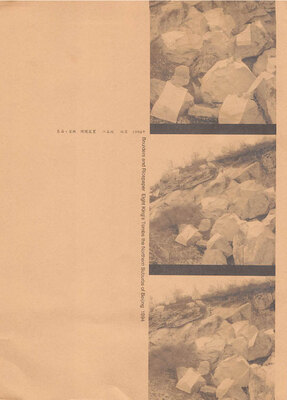 This page comes from a catalogue arranged by Huang Du, a Beijing-based critic and curator. This untitled work is one example of the artist's experimental site-specific work where he places sheets of rice paper in cultural sites in Beijing. Here Zhu placed rice paper in the cracks of the stones in Eighth Prince's Tomb (Note that the English translation in the document is incorrect). (Nicole Wang '26)