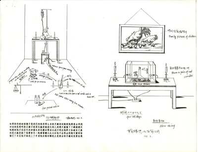 monkey sperm, fermented rice, scallion root, poppy shell, oleander leaf, tobacco. “Medicine” is a conceptual work as photographs show the process that the artist makes of "medicine". According to its documentation, the piece involves a sequence of actions: the extraction of a monkey’s sperm, its combination with various other ingredients, and its eventual transformation into a form of medicine. At the bottom left of the installation, the artist leaves a handwritten note: “If you still believe that the monkey is our ancestor, then when you have a toothache, you should go to them to seek the medicine that can cure you. The day your monkey ancestor evolved into a human, he had a fever — and that is the origin of your illness. Thinking of his descendants’ future happiness, he became so excited that he wept. Now he realizes he has a fever and needs glucose. From that day on, he no longer chases after female monkeys, for he has become obsessed with masturbation — and his sperm is the cure for your toothache.” The bewildered demonstration might refer to Chinese traditional medicine, which is criticized as "unscientific" and "superstitious" by some pharmacists and biochem researchers who have been educated in modern-western medicine. But in the artist's description, he also expresses his idea on Darwinism in a teasing tone. It seems he is pointing out the disturbing correlation between superstition and scientific belief and therefore criticizing the superstition in modern medicine. (Zhuocheng Jiang '26)