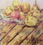 This painting displays Cai's interest in impressionism. Vibrant, contrasting colors come together to present an ordinary bundle of pears extraordinarily. The bumpy texture and subtle green tones of the pears itself may be representing them undesirably, a contrast to the canon of still lives that has preexisted in the history of oil painting. Interestingly, the artist has chosen to paint a bunch of western pears instead of the more common Asian pear that is rounder and yellower. (Nicole Wang '26)